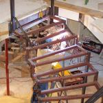 After installing the metal wall plates, I fastened the template to its original position on the floor so I could use it to locate the structural parts of the stair. The plan was to assemble the frame with tack welds and then complete the welds later on. To save time, I hired a certified welder to complete the welds.