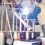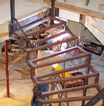 After each set of welds, I checked for alignment using the laser positioned on the floor template as well as an assortment of magnetic levels. Since much of the welding was done indoors, we used a 220-volt 180-amp MIG (metal inert gas) welder (Hobart Welders, 800/626-9420, hobartwelders.com) supplied with a mixture of CO2 and argon shielding gas, which reduces messiness by eliminating the need for flux. The 220-volt welder is good for thicker metal and has a longer duty-cycle time than a 110-volt machine.