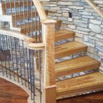 Armin Gollannek owns Northern Sun Woodworks in Munising, Mich. The author begins the new set of stairs by building a temporary platform over the basement stair opening and transferring key locations onto a hardboard template. Here he uses a laser to plumb down the location of the balcony header. To find the center point of the curved basement stair opening, the author draws chords between points on the arc, then a line perpendicular to the center of each chord; where the lines intersect is the center point. After drawing a full-size layout of the stair on the template, he makes patterns of the steel tread assemblies and sends them to the fabricator. The curved bottom plate is located by plumbing down from a laser attached to a trammel that pivots off the center point. A carpenter shifts the position of the top plate so it’s in line with the beam that projects up from the laser . The author uses a temporary wooden stage to support tread frames while he positions them over the template. The block taped to the corner of this tread has the same cross section as a riser bar; its center is being used as the laser target. With the frame positioned horizontally in space, he checks its height against the story pole. He fine-tunes the height of the frame by turning threaded bolts in the stage. Once the frame is in the correct position, he connects it to the preceding tread frame by welding it to a vertical riser bar. Posts are installed between the top and bottom plates of the wall and then welded to the tread assemblies. Once all the pieces are connected together, the stage is removed and the welds are completed. Temporary wooden grounds space the stone off the tread assemblies. When the stonework is done and the grounds removed, the treads will slip into the recesses with no need for scribing. The tops of the treads are screwed to the frame from below, then the sides and bottoms are glued in place. The lower treads of the completed stair seem to grow out of the stone while the upper treads appear to hang in the air.