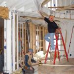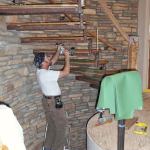 When the welder was finished, I installed temporary plywood treads on the frames and attached 2-by nailers to the tubes in the wall. Next, the drywall hangers installed cement board on the concave side of the wall as a substrate for the artificial stone.