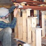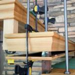 While the masons were installing stone, I was in the shop making the wood parts that would cover the steel core of the stair. Made from a combination of red and curly birch, the cladding was designed in such a way that I could finish the pieces in the shop and install them with the fewest exposed fasteners possible. I fastened the tops of the treads first, screwing in from the bottom through predrilled holes in the frames.