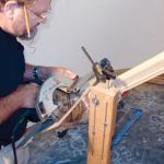 Starting volute. After cutting the easing on the lower volute to the proper angle, I marked the centerline on the curved end of the starter step and estimated the position of the starting newel’s center point. Then I clamped the volute in place, plumbing up from the centerline to a small pilot hole I had previously drilled in its center.