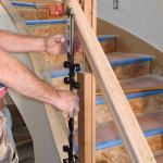 Installation. I used a right-angle drill equipped with a couple of stick-on bull’s-eye levels to bore 1/2-inch-diameter baluster holes in the handrail and 5/8-inch-diameter holes in the curb. The holes in the rail are one inch deep, while most of the holes in the curb are only 1/4 inch deep. Every third layout mark, though, where there was a bar rather than a patterned baluster, I drilled a 2-inch-deep hole. After cutting and dry-fitting the balusters, I sanded and stained the handrail, then finished it with several coats of waterborne polyurethane varnish.