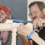 Glue-up. Before gluing it together, I set the handrail on the newels and checked that the volute and upper tandem cap were perfectly level. Instead of Titebond, I used Loctite Hysol E-20HP epoxy (800/786-6272, loctite.com) so I didn’t have to size the end-grain joints. I always try to get the joints as pretty as possible, but if things are not perfect (and they never are), I can hand-sand the rail joints smooth with my Tadpoles.