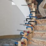 On curved handrail projects I use all the clamps I own, but I particularly like 6-inch and 8-inch C-clamps. They’re just as strong as bar clamps, and they’re deep-throated enough to reach the middle and bottom of the rail. If these areas aren’t compressed tightly against the blocking, the layers tend to separate and will need to be reglued and reclamped.