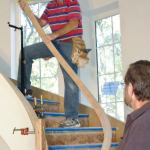 I recently built a circular staircase that has a short landing in the middle and a dogleg at the bottom after three straight steps. In this article, I’ll explain how I installed the balustrade, which curves continuously from the starting volute up through these transitions to a level landing rail at the top, staying within the code-mandated 34 to 38 inches the entire way.