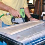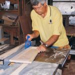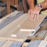 In preparation for assembly, I ripped 3/4 inch from the 1-7/8-inch-wide stiles of two of the frames. I also cut a 15-degree angle on the bottom rail of each frame, using the table-saw miter gauge and the wedge-shaped spacer to hold the frame square to the blade.