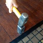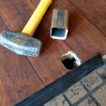 After driving through and removing the top layer of linoleum, I drilled holes just inside my initial cut and continued to drive the square chisel all the way through the floor, alternately driving and drilling as necessary.