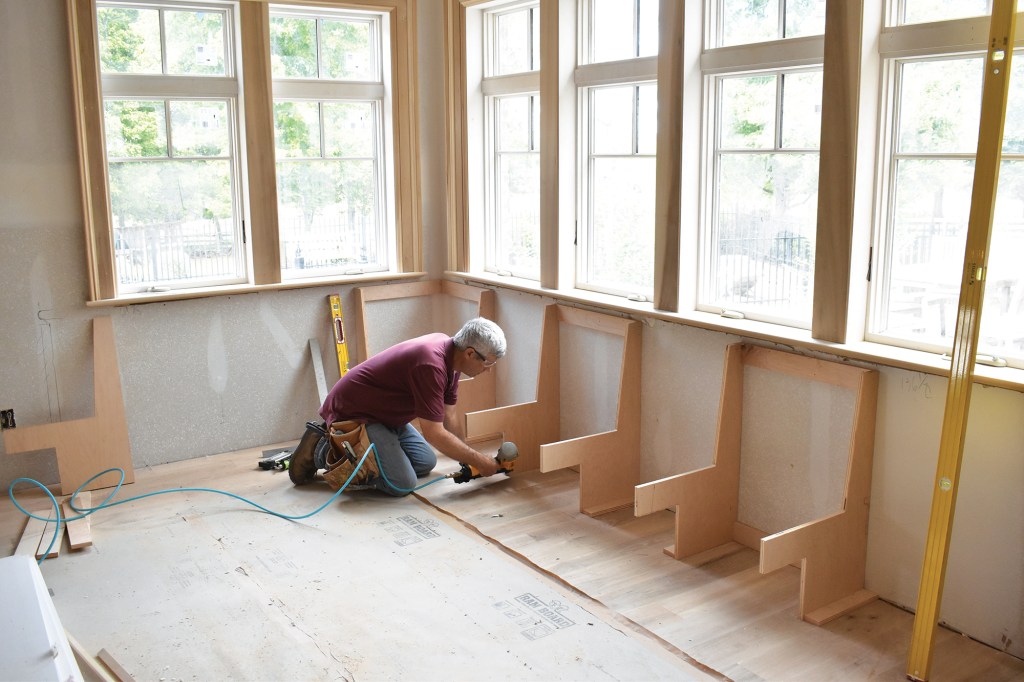The framers I work with are very good, but walls and floors are never perfect. That meant that I had to make small adjustments to the supports so that the seat and back of the finished bench wouldn’t have any dips or humps.