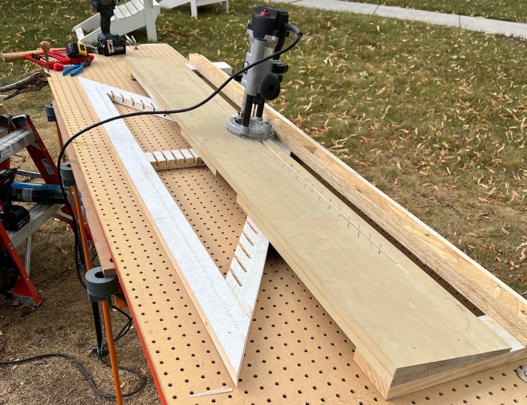 In that case, we set the shelf pins at the ends of each shutter stile and moved the workpieces (the shutter stiles) while keeping the router at a fixed angle, and we used blocks to stop the router at each end of the short mortises. In contrast, for the gable-end vent, moving the router over a fixed workpiece and using a full pegboard surface was better suited to adjusting the length of each mortise run.
