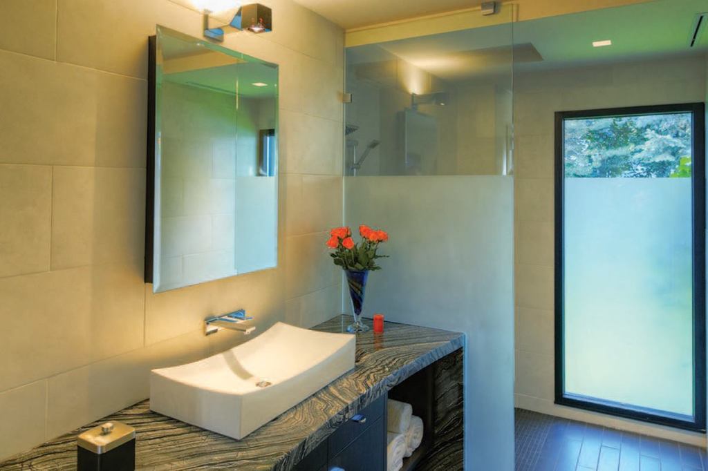 The original master bath in our client’s house had only 36 square feet of floor area, barely enough room to turn around in. Though we sketched out some preliminary designs that would provide more space, we had to shelve them when we discovered our proposed addition would straddle a 10-foot-wide utility easement that included a major sewer line for a nearby housing development. Staying within the existing footprint and expanding into an adjacent guest bedroom wasn’t an option, so instead we overlaid the easement onto the site plan and designed within the space left inside the county’s required 5-foot setback. The result was a 115-square-foot six-cornered addition, with each corner no closer than 5 feet to the sewer line. The “stepped” design is a little unusual, but our clients love the way it dresses up the rather nondescript gable end.