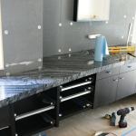 We left the framing exposed where the cabinet would be mounted so that we could fasten it directly to the LSLs with 3 5/8-inch-long LedgerLok screws. These fasteners have oversized washer heads and a lateral design value of 255 pounds in structural composite lumber. We used three fasteners per stud – plenty to support the 400-pound Kenyan marble countertop and heavy cabinet. We’ve used these construction details and screws in a number of similar installations in the past and have never had a problem with any of our cabinets coming loose or sagging.