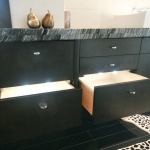 The stained maple cabinet has a conversion varnish finish and is fitted with inset doors and drawers. We mounted the drawers on Accuride Eclipse 3132EC soft-closing undermount slides ( accuride.com), which are easily adjustable – a nice feature when working with inset drawers. When the drawers are open, the slides remain concealed, while the interiors are illuminated by automatically switched low-voltage LED lighting.