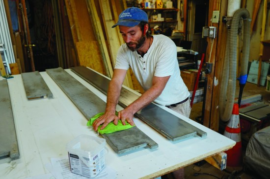 I’ve tried the whole spectrum of sealer choices and hadn’t found the right one until recently. There are drawbacks to most options: Epoxy sealers can look wet and artificial; acrylic sealers are prone to hazing and streaking; and waxes (such as Feed-N-Wax, for example) give a great finish but need maintenance and don’t actually seal anything. Recently, however, I started using ICT PS1 Reactive Sealer from Buddy Rhodes Concrete, a hybrid between penetrating and micro-coating systems. This coating provides excellent protection without sacrificing the look or feel of concrete. The Buddy Rhodes website provides good instructions, and the sealer is easy to apply without drips or runs. If time allows, let the sealer really harden up before you manhandle the sills into place.