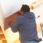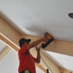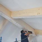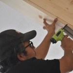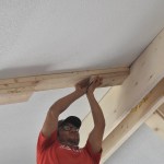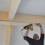 Before the drywall is installed, we like to add blocking between rafters since the beams rarely land on a rafter, and the blocking helps to ensure a straight and secure fit of the beams. We ask the framer to add flat 2x6s on 4-foot centers. If that step is missed or a client changes their mind later in the project, the blocking can sometimes be added from above. If all else fails, we have glued a strip of 1×6 to the ceiling, let it fully set, then nailed a 2×6 to that with success.