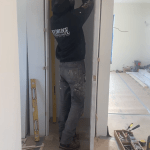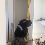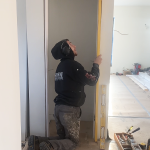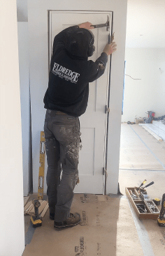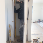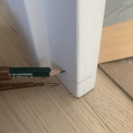 When I’m the one who’s doing everything, I install the floors first, when nothing is in my way. After that’s done, I scribe the door jambs to the floor. This adds some extra steps to the door install, but they are minimal, and it’s much easier to define the height of the gap you want under the door. I like to go with a 1/2‑inch gap, but sometimes that’s not large enough if there will be rugs on the floor.