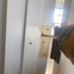 I then shim behind the strike plate until the gap is correct. You might need to shim in some more spots to keep a nice, even reveal all around the door. Just make sure to add a screw to keep all the shims in place. Finally, I shim and screw the head jamb to keep it from sagging.