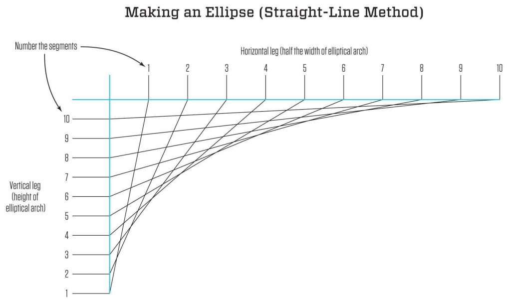 To create the ellipse, I start by drawing an “L” shape, where the vertical leg equals the height of the elliptical arch, and the horizontal leg represents half of the ellipse’s width. Next, I divide each of those lines into the same number of segments. The more segments I use, the more accurate the shape will be (see illustration, below). Then I number the segments “1” through whatever number of segments I’ve decided to use. On the horizontal leg, the numbering begins at the mark closest to the intersection of the two lines. On the vertical leg, though, I start the numbering at the mark farthest from the intersection.