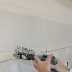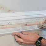 To begin, I snap layout lines, then screw (where there are studs) and glue (where there aren’t) strips of 1/2-inch drywall cut to fit. I tape the seams with fiberglass mesh tape before attaching the beads with spray adhesive and staples.