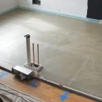 After snapping layout lines on the floors for the cabinetry, we cut the mats and put them in place. Even though they have self-adhesive backing, we also used duct-tape “Band-Aids” and some thinset to hold them and the wiring in place until we poured the SLU. Then we double-checked the wiring continuity with a multi-tester before giving the installation another coat of SLU primer, using a brush to agitate the primer and make sure the mats were adequately covered.