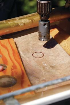 One complication is that the plywood guide inhibits the free flow of clean water. Therefore, I remove the plywood guide as soon as the bit creates a continuous circular kerf in the tile. This kerf will guide the bit the rest of the way through the tile.