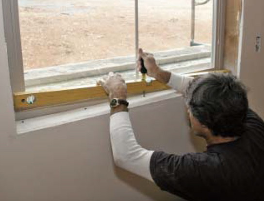 While one carpenter measures windows and builds jamb extensions, the other preshims all the rough openings with drywall screws.