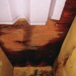 Moisture-meter readings of the plywood ranged from 26% to 76%. Staining on the sides of the rafters showed where water had dripped down to the ceiling level. I removed a recessed light from the tongue-and-groove ceiling area of the loft and pushed the insulation aside. The moisture in the sheathing measured between 24% and 35%.