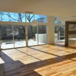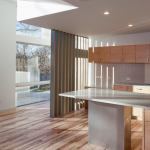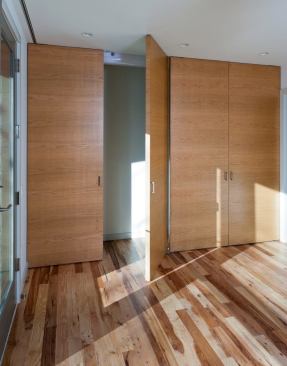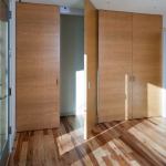 It’s a remodeled 1960’s house with architecture by Webber + Studio Architects, in Austin, Texas. This is a solid 3/4-inch pecan floor nailed to 3/4-inch plywood over a vapor barrier on a concrete slab. We laid the floor with raw wood then sanded just the edges of the floor where base molding would hit the floor (in order to eliminate shoe molding, we install floors first, then base).