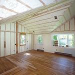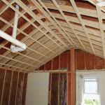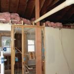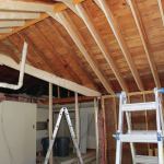 With all the new rafters in place and both ends of the ridge supported on posts, the crew ran furring strips over the whole ceiling and filled in the framing above the bathroom walls and over the flat ceiling. Insulation and drywall followed closely after the plumbing and electrical work, and I came in with my crew afterward to finish off the project.