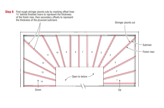 Most plans provided by architects show half of the stair on the lower floor plan and half of the stair on the upper floor plan, which doesn’t help me much. Both my scaled stair plan, which I use as a presentation drawing for the GC and client, and my full-scale layout show each floor-to-floor stair run as a unit.
