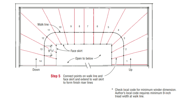 When designing winding stairs, this rule — plus making certain that all risers are the same height — is critical. When your feet move the same height and distance forward with each step, the tendency to stumble on a stair is greatly reduced. That’s why the walk line is my first consideration when I draw a stair in plan view.