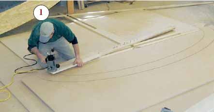 Most carpenters know how to draw an ellipse using string, a pencil, and a couple of nails. But once it’s drawn, cutting and sanding a perfectly smooth elliptical curve takes some time. Stew Junge of Landmark Finish in Boxford, Mass., had a lot of elliptical head casings to make, so he built the large router jig shown here. It’s a temporary setup: strips of wood nailed to the floor in a “T” configuration, spaced apart so that blocks of wood can slide between them.