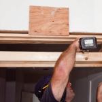 I pull the pins and remove the door from the jambs. I also remove the jamb hinges, because they can interfere when plumbing the jambs. To keep the jambs parallel, I install a temporary spreader just below the bottom hinge location. It’s cut to the exact length of the head jamb and held in place with a couple of finish nails shot through the jambs from the back. It’s easily knocked out later; I pull the nails all the way through the jambs from the finished side. To ensure a level head jamb, I first check the level of the floor and then mark and cut any difference from the jambs accordingly.