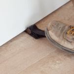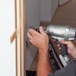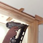 With the door mounted, I tighten the loose screws. I add 3-inch finishing screws, through the jambs into the framing, on either side of the door stop, everywhere I’ve placed shims. I then check the reveal between door and jamb for uniformity. It’s weird, but no matter how carefully you install the jamb, you can still end up with a squeeze in the reveal below the bottom hinge. I’m not certain why this happens, but I do fix it: I adjust the shims near the floor and send in a pair of 3-inch screws to pull the jamb over. Because I’ve shimmed directly behind the bottom hinge, the jamb only moves over from there down.