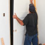 A door should always close with full contact against the stop. For this reason, out-of-plumb framing, bowed jambs, and warped doors are all unacceptable. I either correct the framing or replace the door. I’ll make slight adjustments for alignment by shimming behind the temporary retaining blocks, holding the adjustment position with a finish nail or two, then following up with the 3-inch jamb screws.