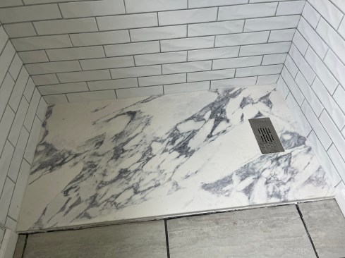 On a recent project, we used one of those products. Instead of going with a traditional acrylic- or mud-floor tile shower, the owner opted for a cast shower floor. We selected one produced by Castico and ordered it through Home Depot.