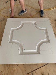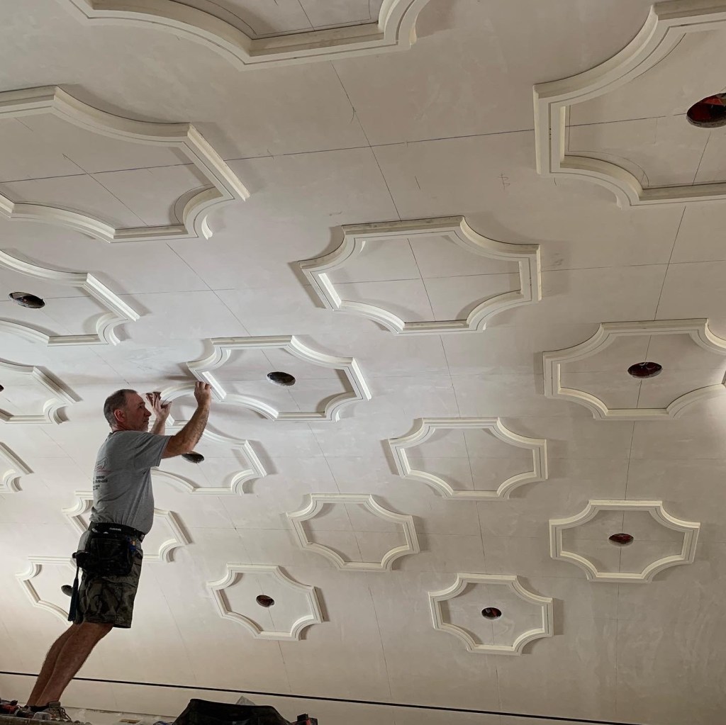 The main event was the intricate ceiling design profile. Should he risk plaster? Every time Roper poured a cast, it broke. Scratch that. How about wood? Backfilling the space created by the sloped ceiling could separate. Then it hit him. To build up the profile, why not cut out and laminate PVC sheeting? Not only would it have a bit of needed flex but it would also be comparatively light and crack-proof. “I ran it by the architect and owner and they loved the idea,” Roper says.