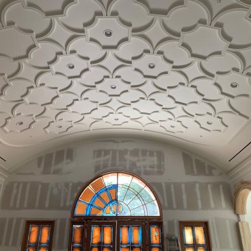 The PVC solution worked like a charm. First, Roper and his installation team covered the curved ceiling frame with metal lath using Loctite PL construction adhesive, followed by 1-inch gypsum plaster. Then the AZEK PVC decorative elements were affixed, also with Loctite PL construction adhesive and trim screws.