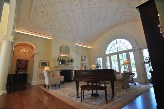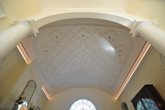 The lavish ceiling effect was a carryover design from the client’s previous home, though that ceiling was flat. Hmmm … curved ceiling, 19-foot height, Louisiana heat and humidity, intricate moulding and installation, cracking and separation issues, embedded lighting, sprinklers, ductwork.