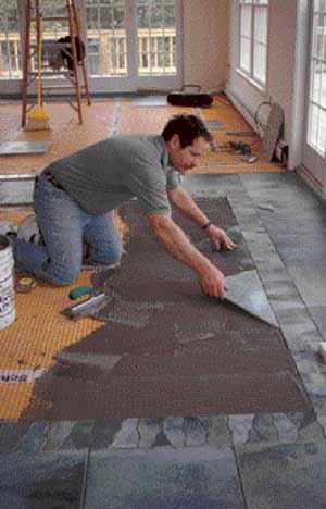 Most of my residential tile work centers on the kitchen or bathroom, but some homeowners also like the look and feel of tile in other parts of the house. One of the most extensive jobs we’ve done lately involved tiling every floor but the staircase in a two-story, 2,500-square-foot house, including an ornamental rug-pattern area in the great room. This was an interesting project for us because the homeowners — who happened to own a chain of upscale tile stores — were unusually well informed about the latest tile installation products and techniques.