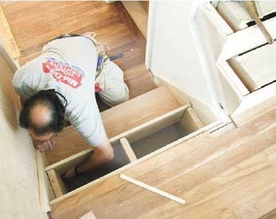 Routs in the skirtboards are cut to allow the treads and risers to be deeply inserted on one side…