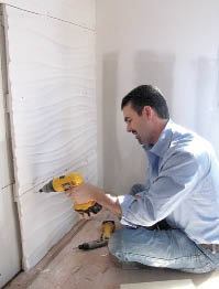 Although they’re noncombustible, the panels are not fire-rated, so they have to be installed over drywall or another code-compliant substrate. In the media room, we installed new drywall over the existing wall framing. Since the framing wasn’t very straight, we then flattened the wall with shimmed 1-by furring (photo, below left).