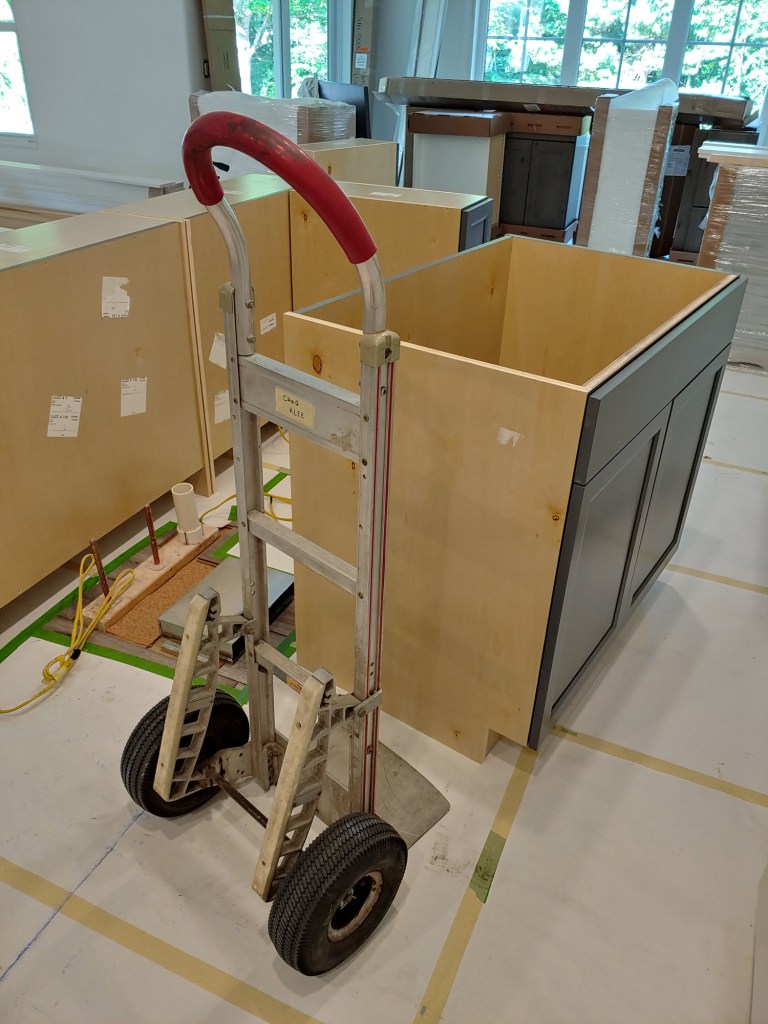 First, I use a dolly cart (aka hand truck) with soft rubber tires. I can wheel cabinets around and not end up with a sore back every day. I have an older aluminum one and I can definitely say it has earned its place in the tool trailer. There are other carts designed specifically for moving cabinets around, but this works fine for me. Smarter, not harder.