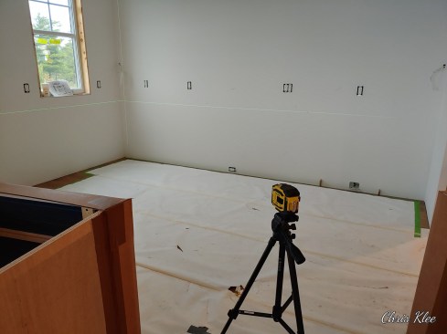 When starting a layout, I like to use a laser to gauge points around the room, mainly the high and low points in the floor. A Stabila green laser on a good stand with a telescoping gooseneck, like this Bosch tripod, makes it easy to get a good level line at cabinet height.