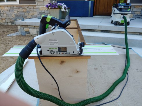 If there are multiple cabinets in a run where the sides are all covered, then you can cut a little extra and shim it back up as needed. This makes it go a little faster and can be done with a track saw, like the Festool TS-55. A cordless version of this saw is handy for cabinets and you can take the saw to the work.