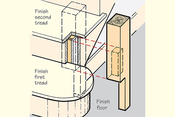 Beyond this, layout differs for bottom and top newels. For the bottom newel, the lower section must be cut to fit around the curved riser box used for the first step. In addition, the pocket needs to make way for the tread to slide underneath. And over the tread, the notch positions the newel front to back so that it catches the overhang of the next tread up. For a landing newel, the pocket positions the newel from front to back in the same manner. On the lower portion of the cut, however, the newel runs full width.