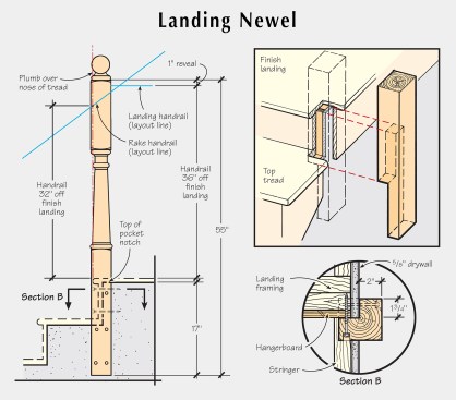 Landing newel. The landing newel is a little bit different — it has a longer top block that allows it to pick up both the landing rail at a height of 36 inches and the rake rail at 32. Leaving a 1-inch reveal above the landing rail, the top edge of the newel block has to be 37 inches over the finish floor. The bottom end of the landing newel should extend below the face skirt board. Typically, you also have an apron on the landing. If the stair turns and rises up the next run, the next face skirt will also butt into the landing newel. In either case, it’s common to run base cap upside-down on the apron, or under the face skirts, and your newel has to be long enough to catch every-thing. I always draw it out full-size (either on the wall or on paper) to determine what that length is. Typically it’s around 17 inches if you use a 1×10 for your skirt board.