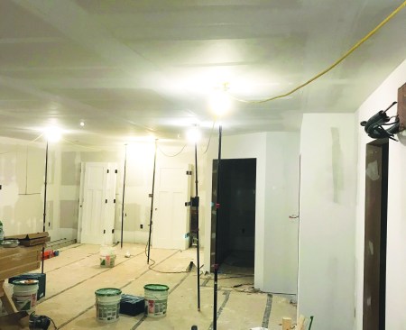 Here’s an easy solution to jobsite lighting. Like many builders, we have used light strings during framing and mechanical rough-in, when it’s simple to hang the lights on framing. We use 100-foot strands with 10 lights spaced 10 feet apart, and use LED lamps because they’re more durable. But during drywall, taping, and painting, it’s not so easy to hang them. We (and many others) have tried laying light strings on the floor, but that doesn’t work so well—they get stepped on and provide poor light. Enter spring-loaded dust-wall poles. These keep string lights off the ground without putting holes in the ceiling. Quick and easy, but a great solution.