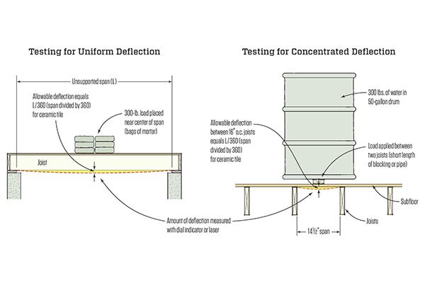 A: Michael Byrne, a veteran tile installer and the moderator of JLC’s Ceramic Tile online forum, responds: Because your floor construction is not standard, you need to measure both concentrated and uniform deflection before attempting a tile installation. The measurement for concentrated deflection is taken from the subflooring mid-way between two neighboring joists, while uniform deflection is measured from the bottom of an exposed joist located more or less in the center of the whole floor. If there’s no access to the joists from below, uniform deflection can be measured from the subflooring, directly above a joist located near the center of the whole floor.
