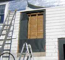 Next, I went outside and with a circular saw and a reciprocating saw cut gaps in the studs to accept the header and sill frame (1). After nailing off the new framing, I drilled pilot holes through to the inside at the four corners so I’d know where to cut the plaster. Back inside, I marked the R.O. on the plastic (2), then cut through both plastic and plaster with a circular saw. A helper outside grabbed hold of the studs during the cutting and was able to lift the whole rectangle of plaster, lath, and studs out and to the ground in one piece (3, 4).